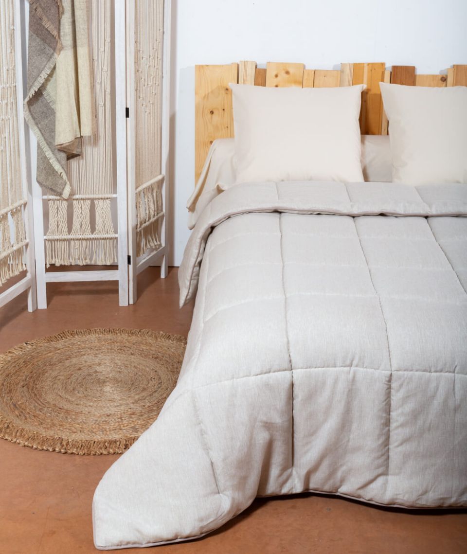 Densité de 500g/m². Couleur poivre et sel. Nappe de laine maintenue par piquage. Enveloppe en lin lavé, cultivé et tissé en France, certifié OEKO TEX.