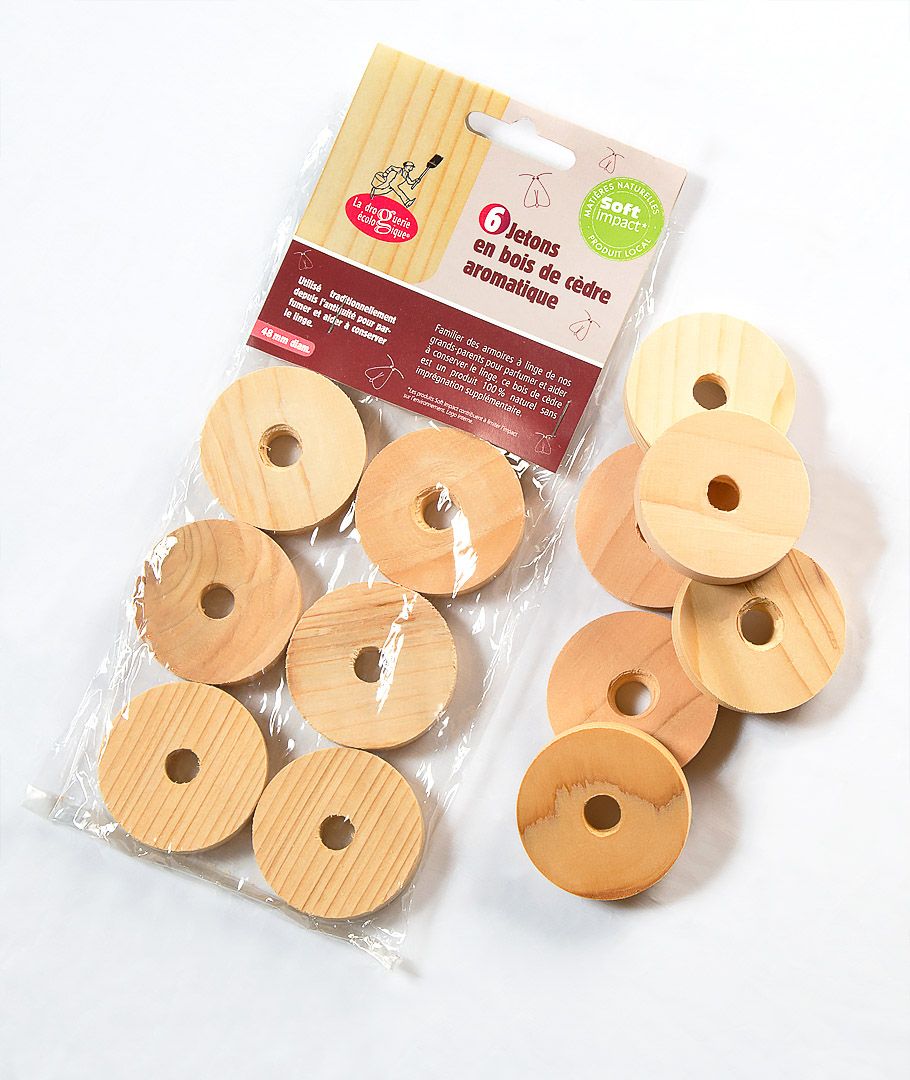 Efficace et naturel, découvrez les jetons antimites en bois de cèdre. Cette essence est un répulsif contre les mites, à utiliser de façon préventive (elle n'élimine pas les mites déjà installées).